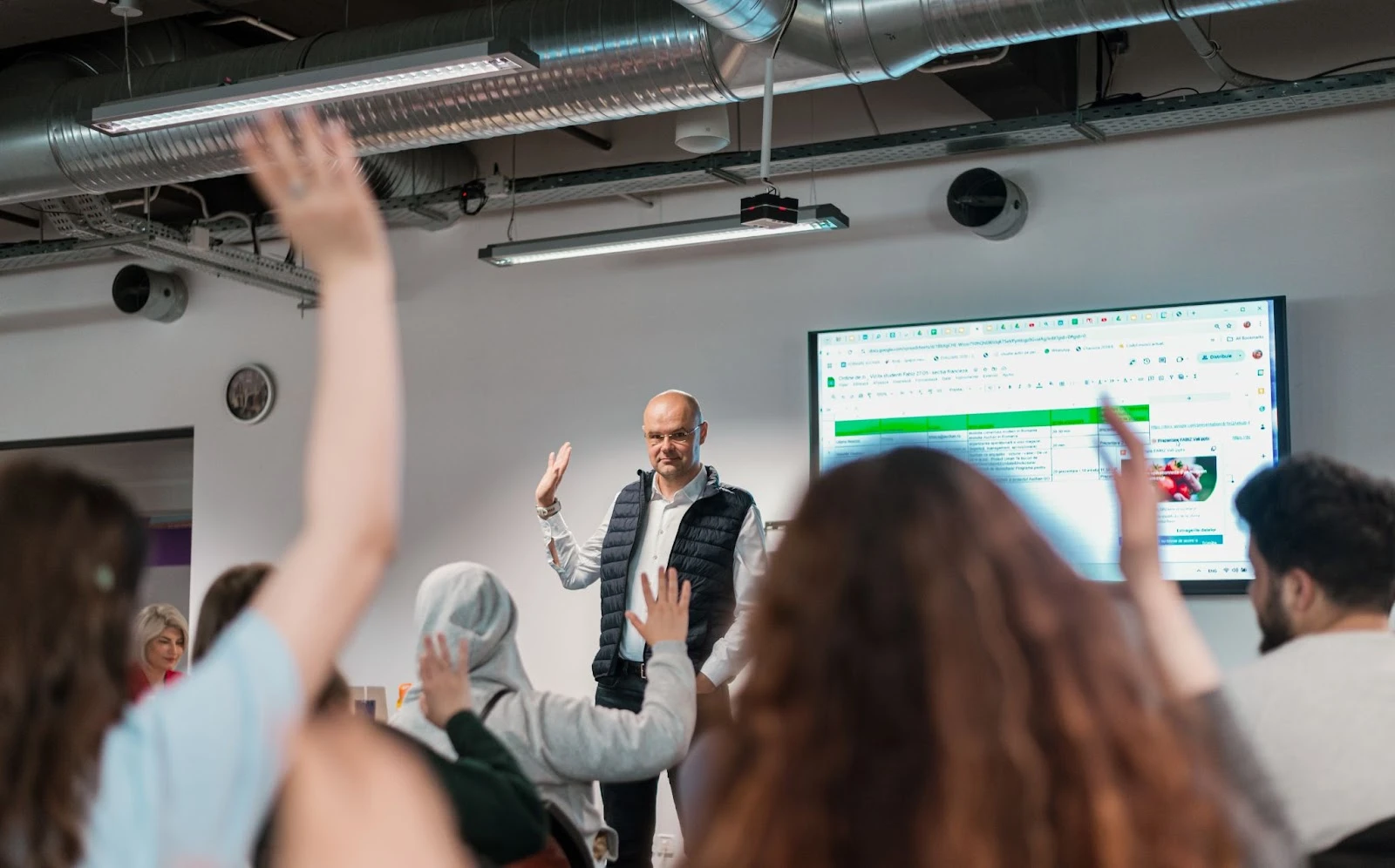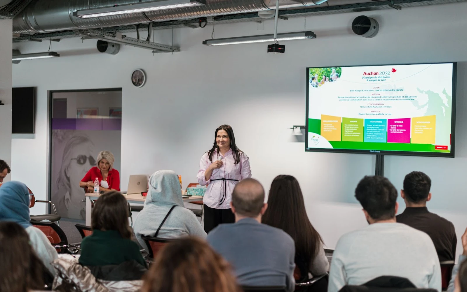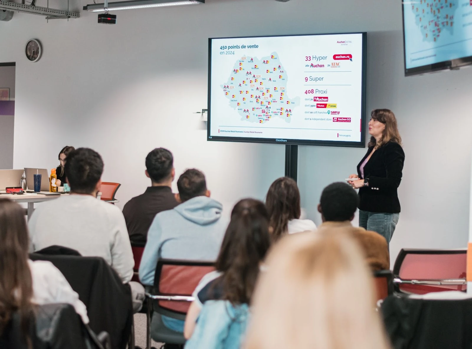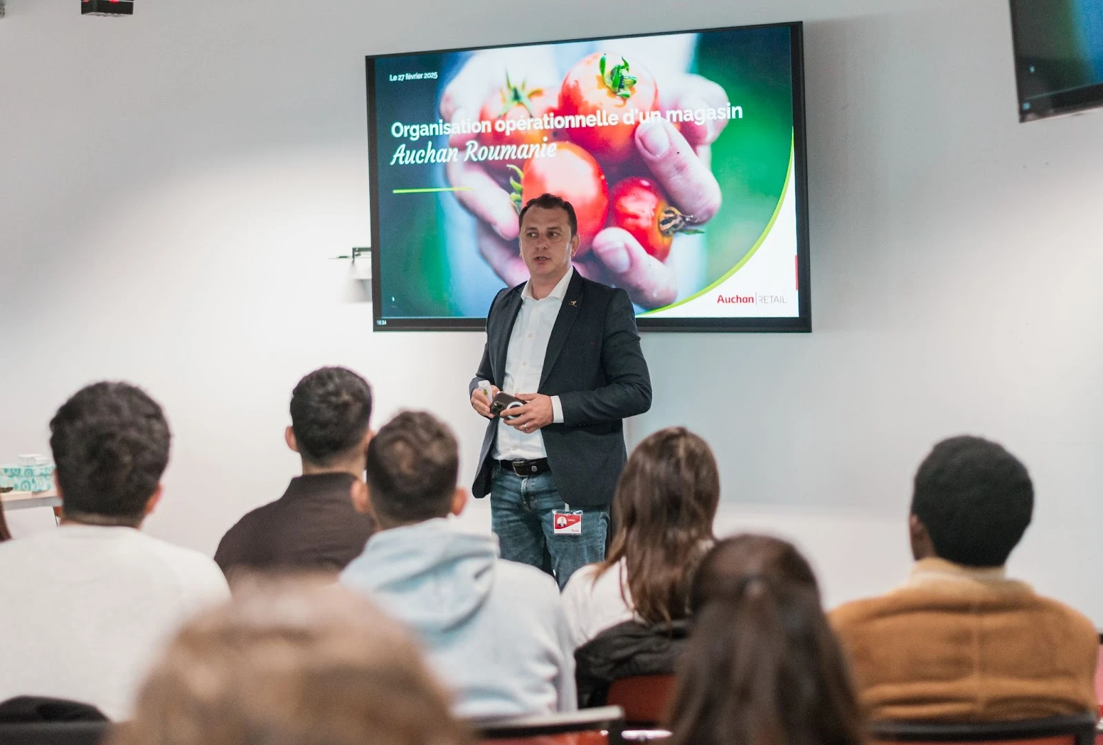Întâlnirea a demarat cu o scurtă istorie a comerțului în România, realizată de Liliana Neacșu, Director Produs Non Alimentar, care a parcurs povestea Auchan și a prezentat Viziunea noastră 2032. A continuat cu Valentin Gealapu, Director Zonă de Viață, care a vorbit despre structura și împărțirea pe regiuni, dezvoltare și aspecte operaționale ale magazinelor noastre, completate de direcțiile viitorului și importanța digitalizării, prezentate de Andrei Anușca, Director Transformare Digitală. Andrei a împărtășit informații și despre: aplicațiile noastre: Scan and Go, MyAI precum și despre formatul Auchan Go. În încheiere, Alina Andrei, Responsabil Employer Branding și Comunicare Internă a invitat studenții să descopere Auchan ca angajator, precum și elementele care ne diferențiază: Proiectul Uman "Te bucuri de viață", atmosfera de lucru pozitivă, angajamentul Auchan față de diversitate și incluziune, inițiativele de responsabilitate socială și multiplele oportunități de dezvoltare profesională oferite tinerilor care se alătură Auchan.
